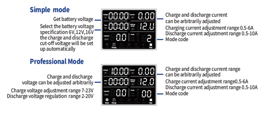 If you are a professional user, you can switch the operation mode to professional one when there is a higher demand.The switching method is: In the stopped state, press the "set" knob for 3 seconds and then release. After hearing the long "ticking" sound alarm, to the mode into professional one. In the professional mode, the battery charging voltage, charging current, discharge voltage, discharge current can be arbitrarily set.